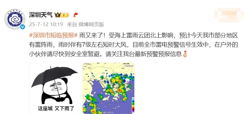 此前,广东省气象部门发布消息称,7月11日至12日,受“丹娜丝”残涡及西南季风影响,广东大部降雨持续,暴雨范围广、局地雨量大。出行要注意降水造成的低能见度、积水、路面湿滑及可能出现的局地滑坡对行车安全的不利影响。
