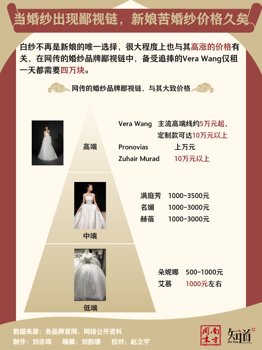 与白纱“告别”的背后,也有一部分原因来自于高昂的价格。据网络流传的婚纱品牌“鄙视链”,高端婚纱售价可达十万元以上,平价品牌也要千元起步。