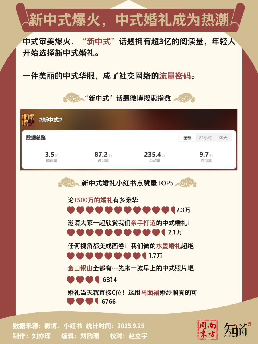 在各大社交媒体上,关于新中式的讨论愈发火热,比如在微博上,“新中式”话题的阅读量已突破3亿,而乘着这股国风热潮,“新中式婚礼”也逐渐成为许多新人的心仪之选。