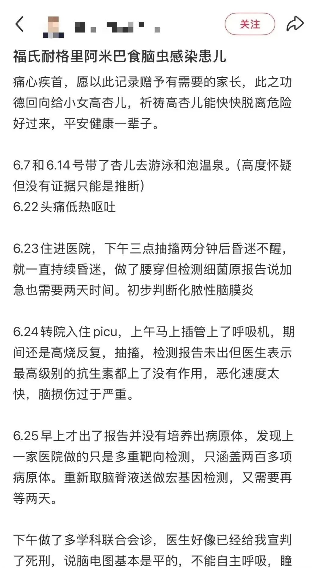 此前,一名5岁女童家长在社交平台的求助信息引起广泛关注。家长称女孩于6月7日和6月14日游泳和泡温泉,6月22日出现头痛低热呕吐的情况,6月23日住进医院后出现抽搐,随后昏迷不醒,并转入重症监护室治疗,6月27日被检测出福氏耐格里阿米巴病原,情况非常危急。