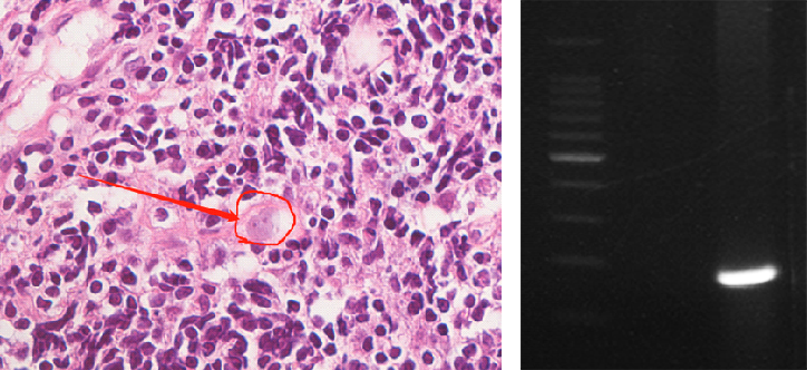 鼻组织显微镜下病理图(左) 狒狒巴拉姆希阿米巴PCR电泳图(右)