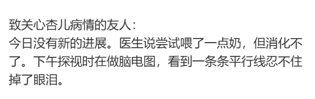 6月29日,当事人更新了近况,称孩子脑电图基本是平的,不能自主呼吸,生命体征也在陆续减弱,“医生好像已经给我宣判了死刑”。目前仍在全力救治中。