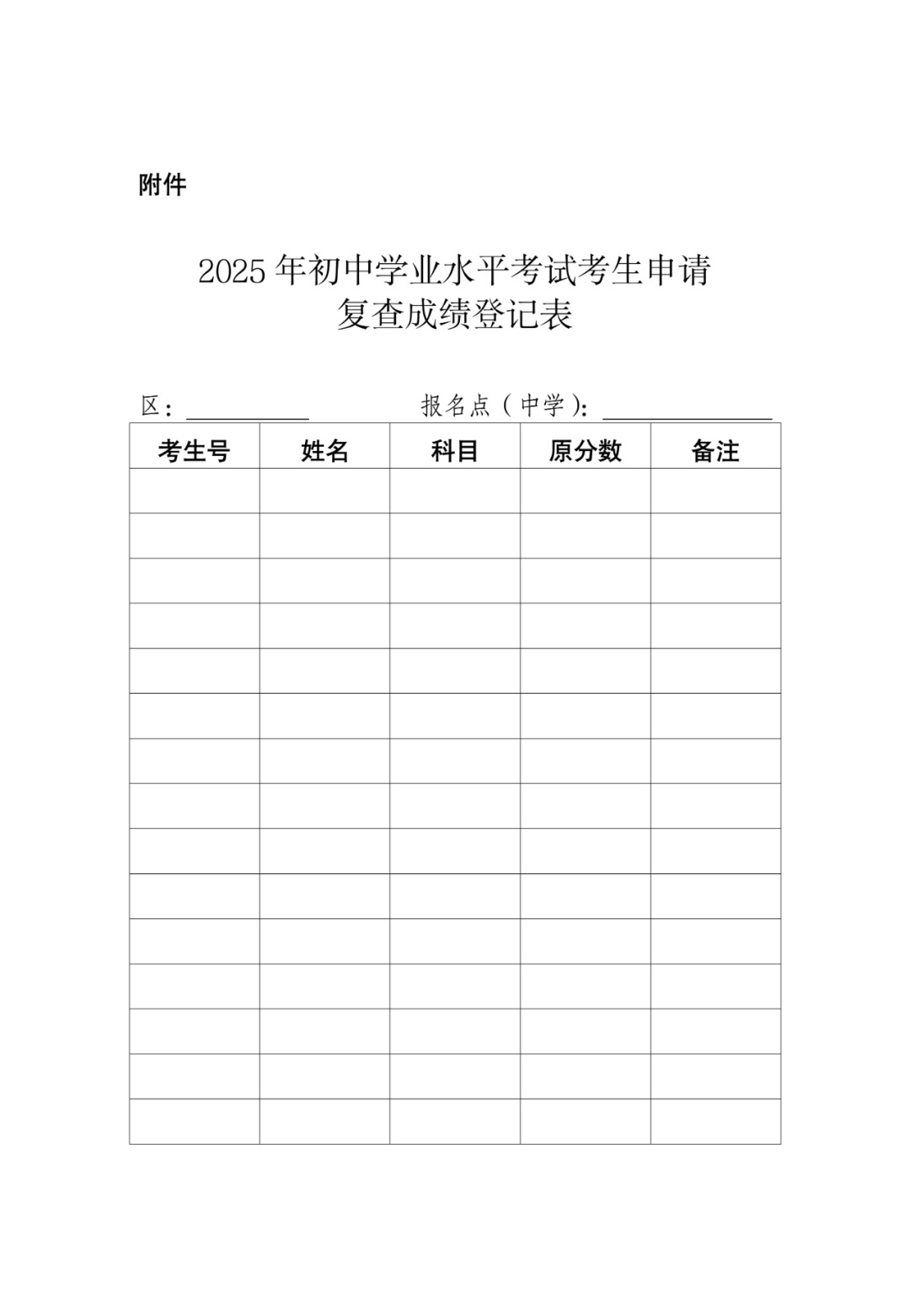 考生如对本人某文化科目成绩有疑问,须于7月14日16:00前凭准考证到报名点(原初中毕业学校)提交复查分数的书面申请(社青类考生可到市招生办登记),并按复查科目填写《2025年初中学业水平考试考生申请复查成绩登记表》。