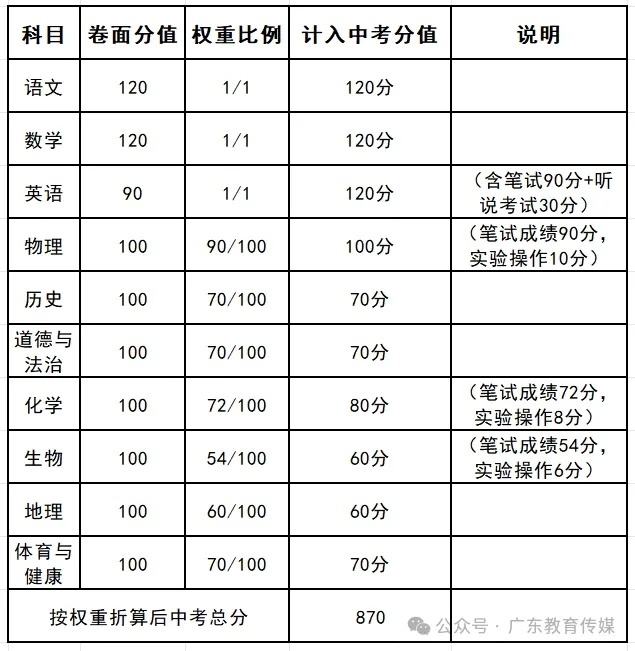 今年云浮中考总分为870分,考试成绩计分方式如下: