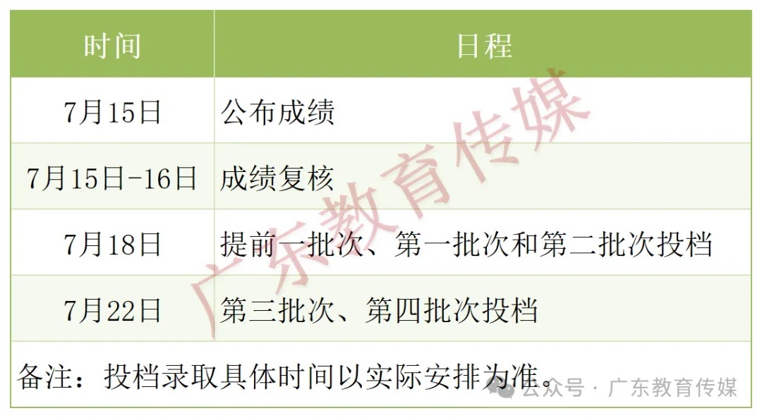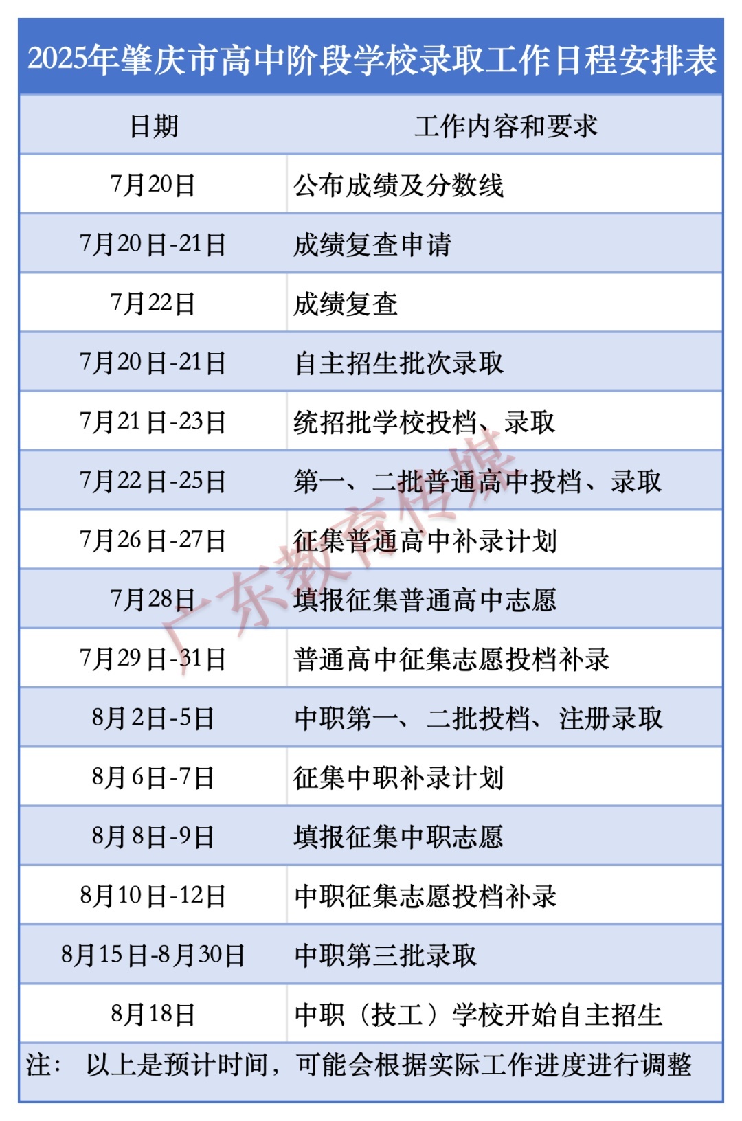 7月11日,肇庆市教育局发布2025年肇庆市高中阶段学校录取工作日程安排表。根据日程,7月20日公布中考成绩及分数线,7月20日开始录取,具体安排如下: