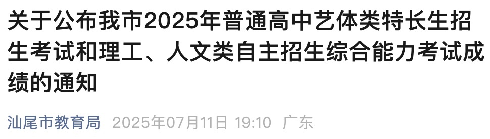 汕尾公布普通高中艺体类特长生招生考试和理工、人文类自主招生综合能力考试成绩。