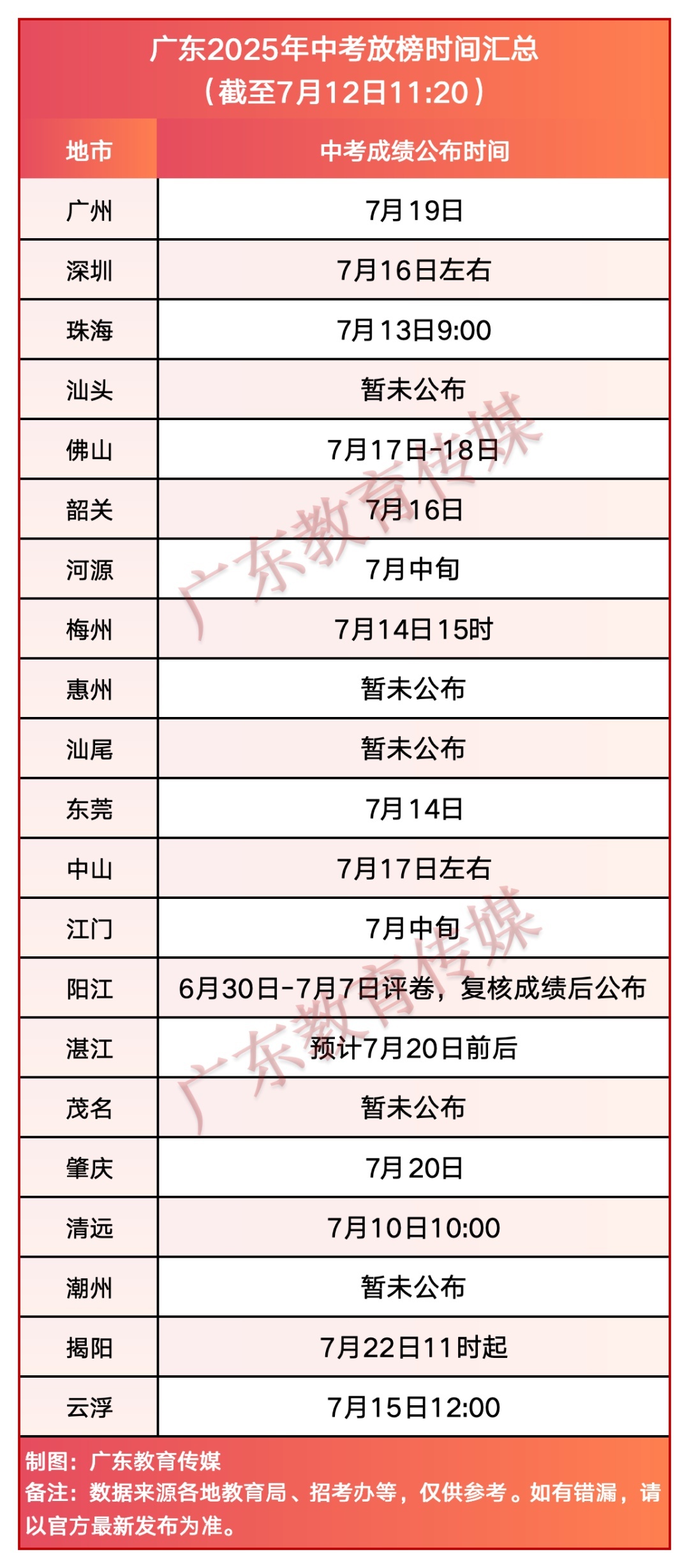 刚刚国融资管,珠海市教育局发布今年中考放榜安排。中考成绩由市教育局统一公布。语文、数学、英语(含听说成绩)、物理(含实验操作考试成绩)、化学(含实验操作考试成绩)、道德与法治、历史科目成绩及中考总分保留1位小数,公布时间为7月13日10:00;地理、生物学成绩以A、B、C、D等级形式公布,公布时间为7月13日15:00。